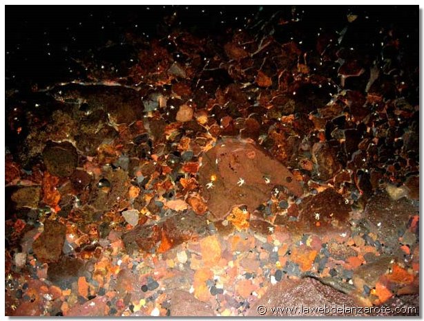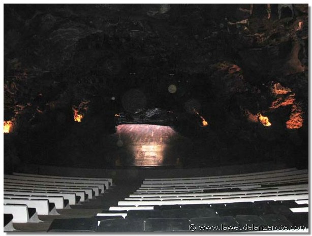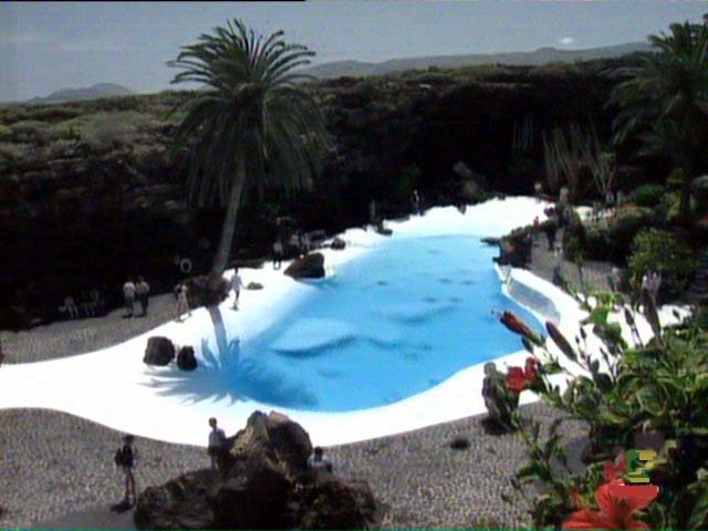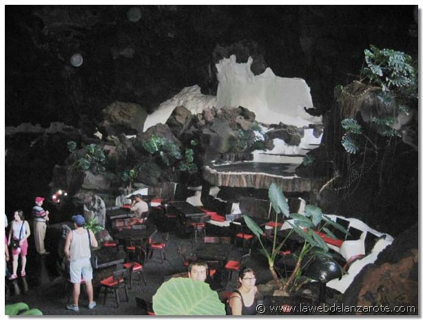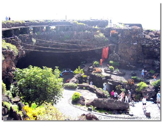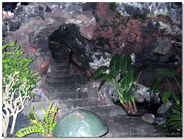 Jameos del Agua. Situado en la zona norte de Lanzarote, al lado del mar. Forma parte un túnel de lava (de siete kms. de largo) que discurría desde el volcán de La Corona hasta el mar. En su día un río de lava corrió por éste hasta el mar. Cuando hay un desprendimiento y se rompe el techo del túnel se forman los llamados 'jameos' (huecos o agujeros que dejan el cielo al descubierto). En este lugar hay dos jameos, separados por unos 100 metros de túnel que albergan una laguna de agua del mar muy transparente y en el que vive una especie de cangrejos diminutos, albinos y ciegos, exclusivos de la isla de Lanzarote. El túnel viene desde el volcán de La Corona (de hace 3.000 años), se prolonga por la Cueva de los Verdes hasta Los Jameos y continúa, como un kilómetro y medio, bajo el mar (túnel de La Atlántida, el más largo del mundo). Es una zona muy preparada para visitar tanto de día como de noche.